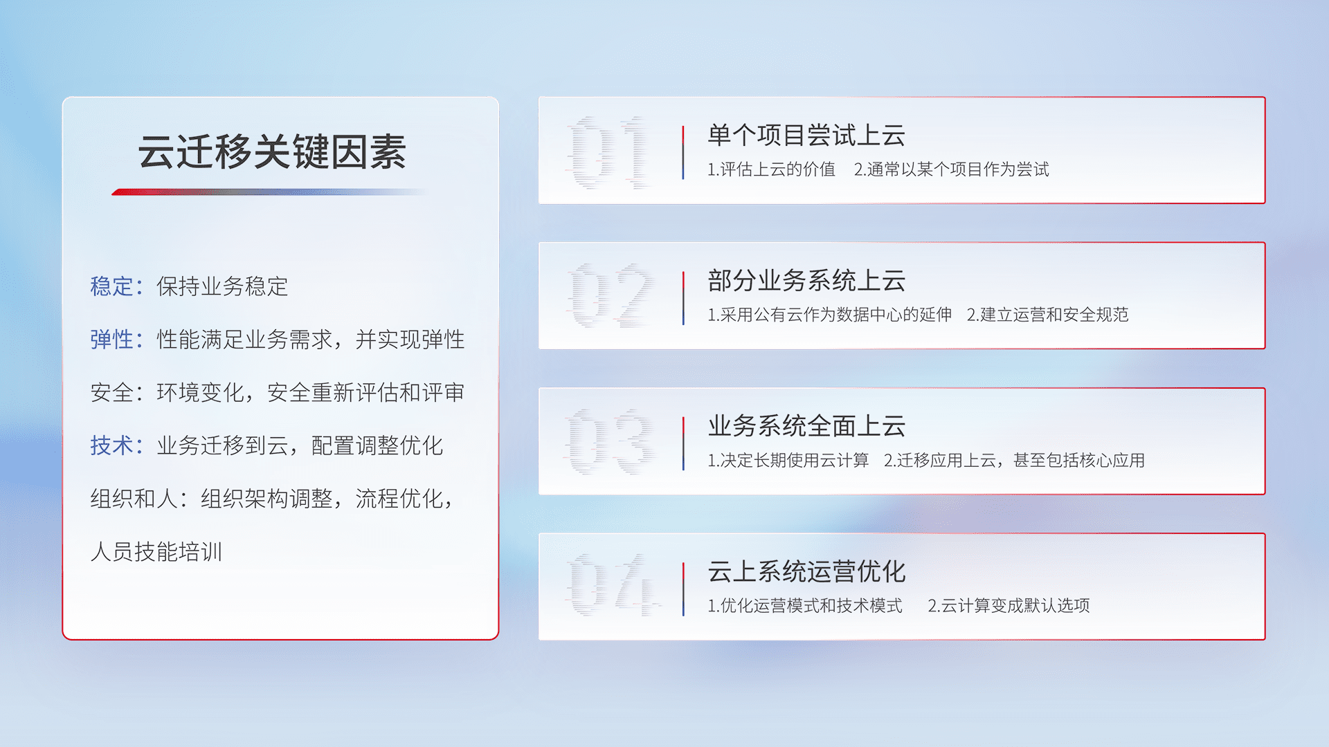 结合实际业务,,,从规划设计、、、、云平台选型、、、云原生改造、、、数据迁移、、、、集成交付,,,迁移全过程为客户识别最佳上云路径,,,做好风险识别管理,,,,设计网络架构、、身份权限、、、、安全审计合规、、、、操作审计、、日志审计、、监控告警策略、、、多站点容灾设计等,,,,对云上基础设施进行整体规划,,提升IT治理水平,,,以满足弹性、、、、高可用、、、高性能的需求。。。