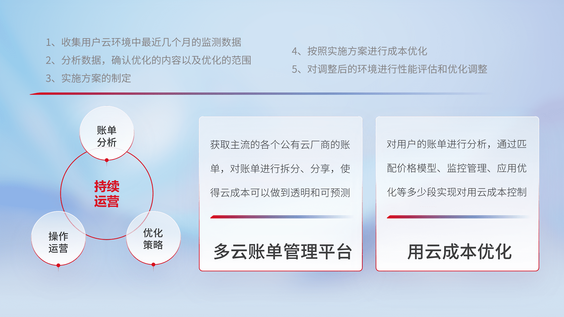 通过多云纳管,,,以统一的资源数据模型把客户的云资源进行抽象和封装,,,进而实现对多云资源的统一操作,,,,保障云资源管理的可靠性、、、、稳定性与可用性。。。量身定制化运维内容,,,,配置、、开发运维、、补丁管理、、备份、、监控、、、、认证和访问管理、、审计和日常巡检等,,,,保障在用云过程中的可靠度,,,稳定度以及高可用率。。。。